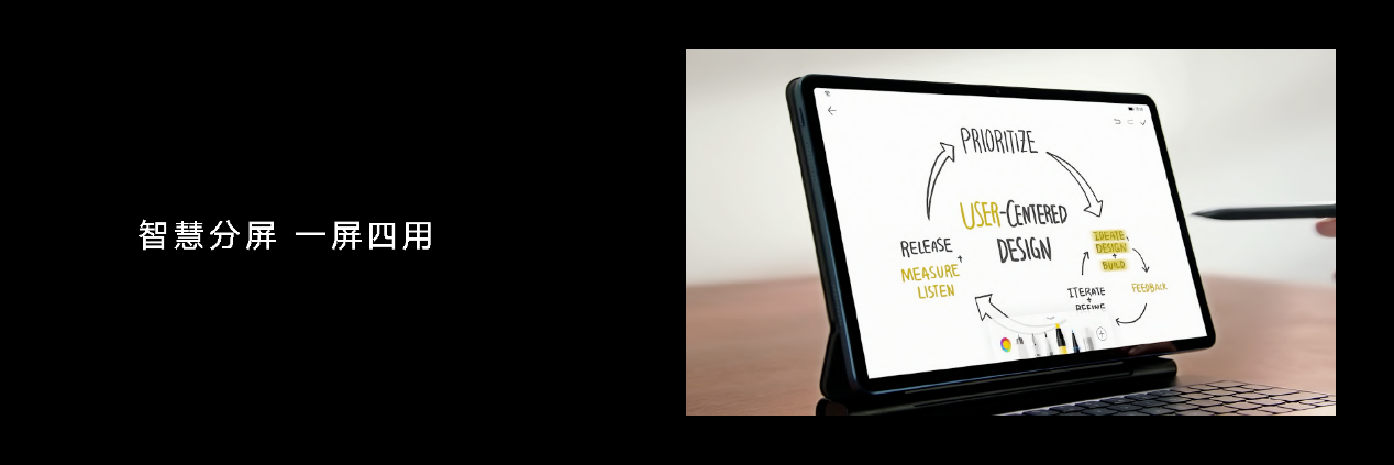 而全新的智慧分屏功能可以实现4个窗口同屏展示,让工作、设计等场景更加高效自由。不仅能够支持双屏的左右对比,还能实现一屏多用,上网课边看视频边记笔记,同步还能接受消息、浏览网页辅助资料,更多应用会收纳在悬浮球中,随时待命。