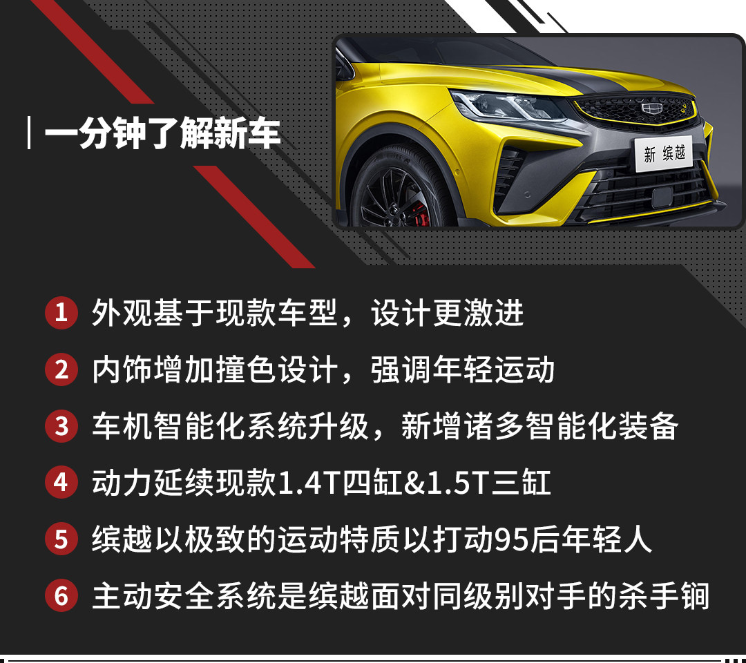 新款吉利缤越定位明确,针对95后初次购车的用户,暂时无需考虑到家庭,绝大部分出行都是单人或者双人出行,对于外观和内饰的个性化程度要求较高。新增的各种安全配置对于日常用车有一定的帮助,至于缤越能不能保持原有的势头,就要看市场的表现了。