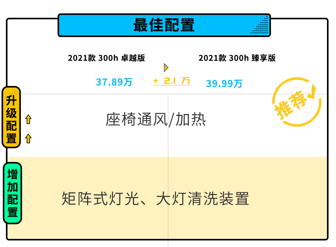 300h臻享版在配置表现上与300h相比仅多出了矩阵式灯光、大灯清洗、座椅通风功能。在定价上要多出了2.1万,考虑到配置的实用性。或许这多出来的预算完全可以省下来。