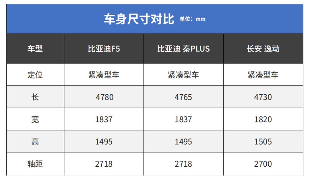 根据比亚迪F5的尺寸来看,新车长宽高分别为4780/1837/1495mm,轴距为2718mm,对比秦PLUS的车身尺寸能够发现,两车的轴距均为2718mm,而宽度以及高度也完全相同,只是两车设计差异导致了车身长度有细微不同。