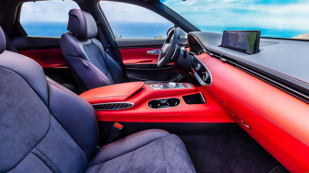 作为韩国背景的车企,自然要有韩国企业在配色、材料上的独特。捷尼赛思GV70中,除了有常见的黑色、米色以及棕色内饰以外,非运动款式还会提供绿色和海军蓝组合的配色以及勃艮第色的搭配。