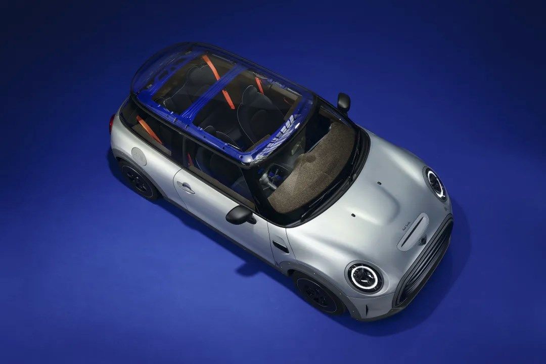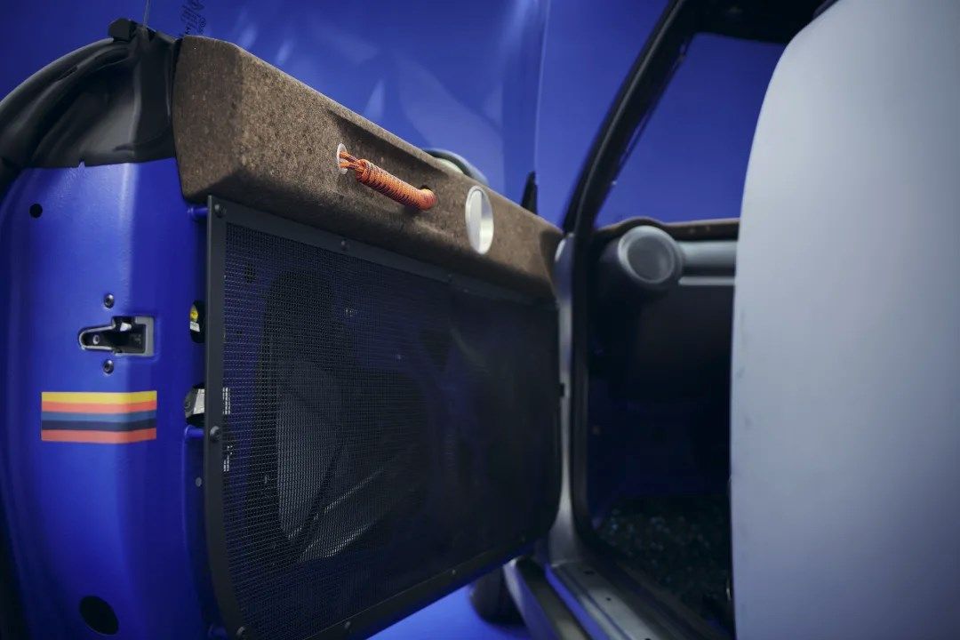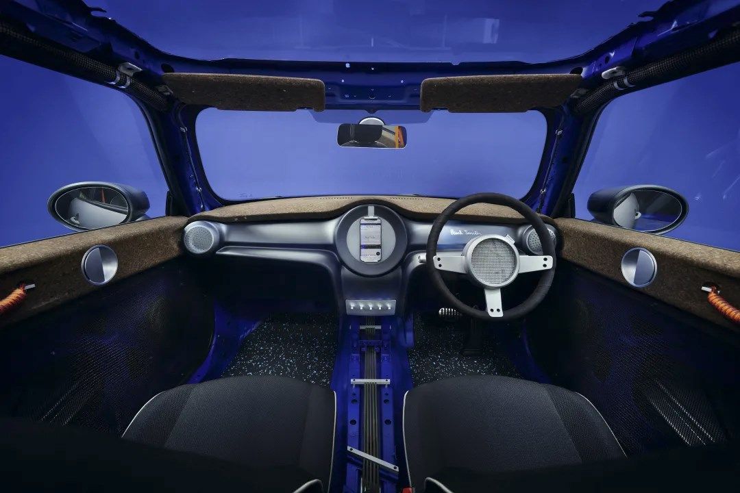 除此之外,整车最亮眼的地方莫过于车顶结构,取而代之的是一整块再生有机玻璃,形成了超大尺寸的全景天窗,甚至,可以看到裸露喷涂过的蓝色车身骨架。的确,营造出的氛围确实是很帅,不过设计师可能没考虑到夏天要顶着大太阳这个的问题。