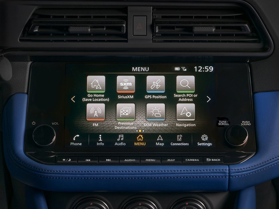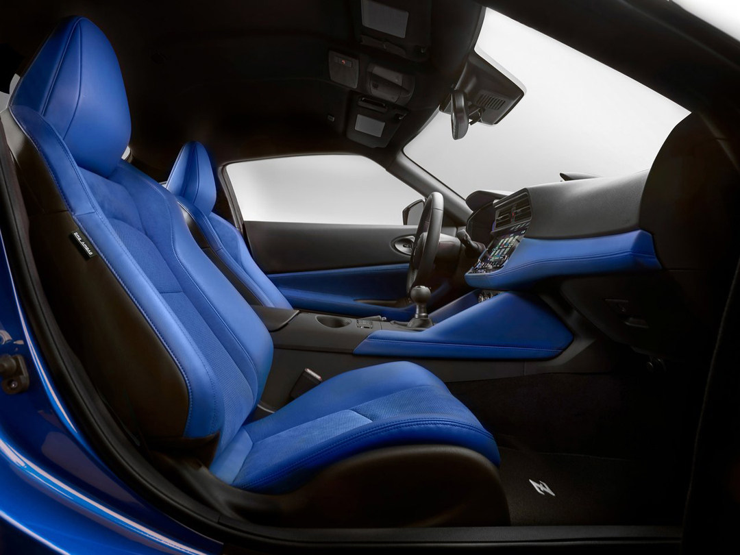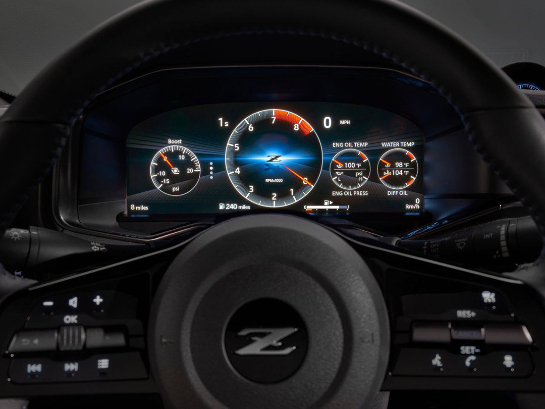 全新Z的座舱将现代技术和复古风格无缝融合,中控台从前几代车型中吸取灵感,开始的设计是取消掉中空调上的三联表,但在日产厂队车手松田次雄等人的建议下,才让三联表保留下来。