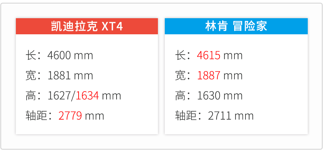 从表格当中我们不难发现,二者的车身尺寸差距并不算太大,林肯冒险家虽然车长更长,但在轴距方面却要比凯迪拉克XT4逊色不少,短了68mm。这对于后排的空间表现有着一定的影响。