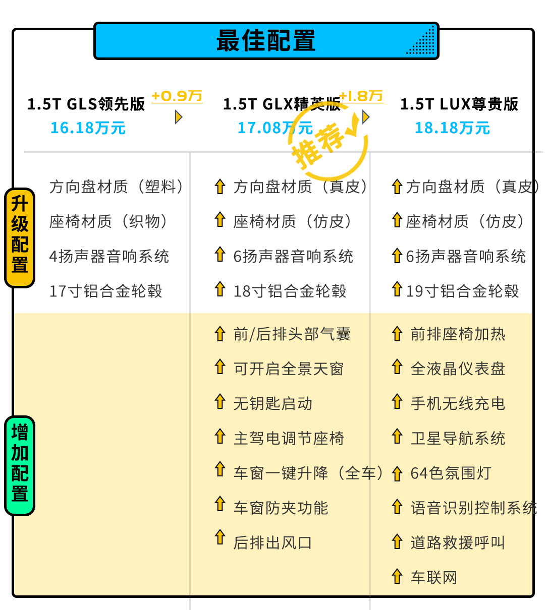 虽然入门车型它的配置体验已经显得足够豪华,但个人更推荐多加9000元升级为精英版,能够额外获得18英寸铝合金轮毂、前/后排头部气囊、可开启全景天窗、无钥匙启动、前排无钥匙进入、真皮方向盘、皮质座椅、主驾驶位电调节座椅、6个喇叭、全车车窗一件升降功能、车窗防夹功能、后视镜电动折叠/加热/锁车自动折叠、后座出风口等配置,升级的配置多达十余项。更重要的是,大部分配置都是我们日常使用得较为频繁的配置,并不会存在配置过剩的上现象,匹配得恰到好处。