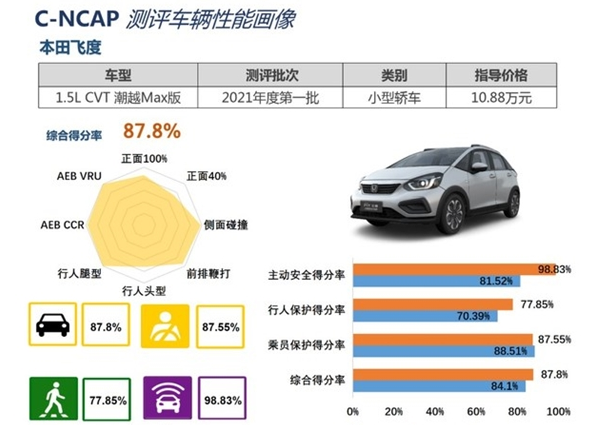 在今年2021年中汽测评C-NCAP的碰撞测试中,飞度在车乘员保护、行人保护、主动安全等项目均取得优越的成绩,更甚是几乎满分的水平,根据各部分得分率乘以各自权重系数后求和,求得综合得分率为87.8%,妥妥达到C-NCAP“五星级”的标准。