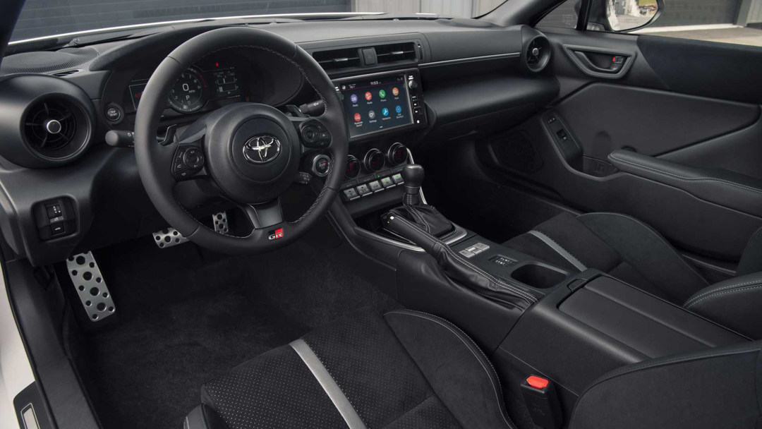 内饰方面,虽然GR 86的中控台布局并没有重新设计,但是加入了许多现代化的配置,例如8英寸的触控屏、液晶仪表盘、自适应巡航、车道偏离预警、主动刹车等,使得它更有档次感了。值得好评的是,其依然采用了机械手刹设计。