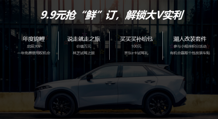 即日起至启辰大V上市日零时,9.9元就可以下订,便可小享受包含年度锦鲤、 说走就走之旅、买买买补给包、潮人改装套件等四重好礼。值得一提的是,该款新车将于不久后的成都车展亮相,对这款车型有关注的消费者可以到现场去一饱眼福了。