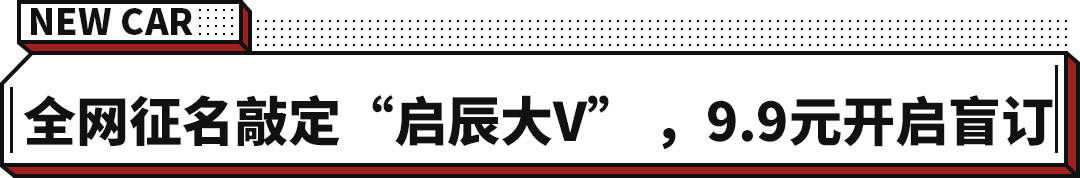 具体来看,在8月13日,启辰就为该款新车在全网发起了“一字万金 为年轻命名”的征名方式,4000多位网友的参与,期间收到天枢”“星耀”等超过1000个名字,最终将新车名字敲定为“启辰大V”,并且开启了9.9元的盲定政策。