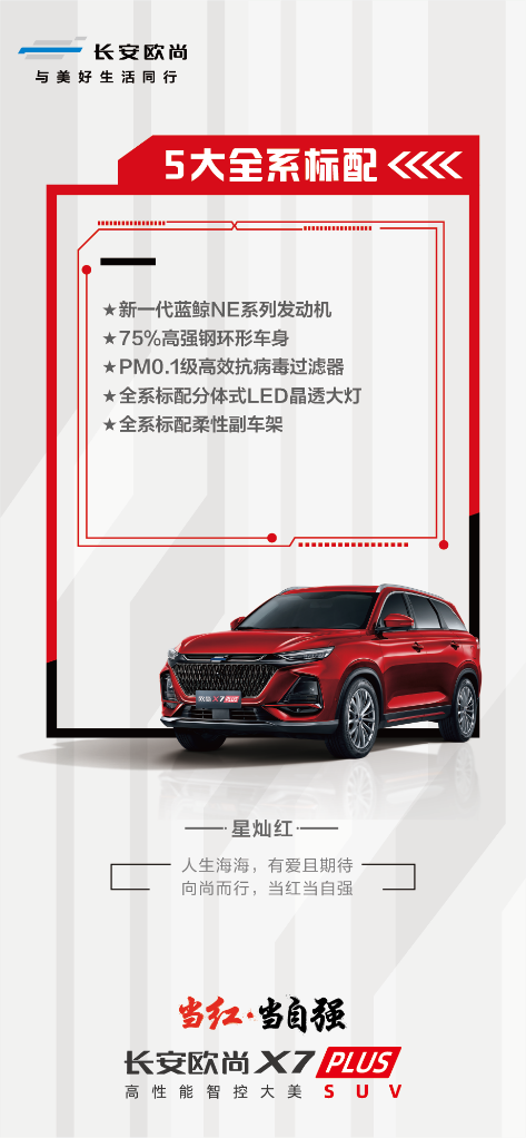 在高价值配置方面,长安欧尚X7PLUS拥有五大全系标配:全系标配新一代蓝鲸NE系列发动机,全系标配75%高强钢环形车身,全系标配PM0.1级高效抗病毒过滤器,全系标配分体式LED晶透大灯,全系标配柔性副车架,包含了动力性能、整车安全、车内环境健康等极具价值的核心配置。