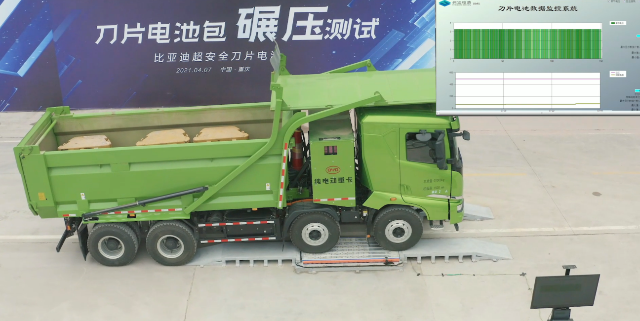 刀片电池包经实测,在承受重达46吨的重型卡车碾压后无明显变形,无烟无火,重新装车后车辆仍可正常行驶。