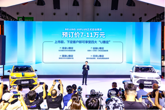 车展现场,北京汽车旗下“7万级悦享生活家轿”——北京U5 PLUS开启预定,预定价格为7-11万元,并享受50元抵5000元、0首付/0月供/0利息、 至高5000元置换补贴、整车终身质保及终身免费基础保养的等四大“U惠定”好礼。