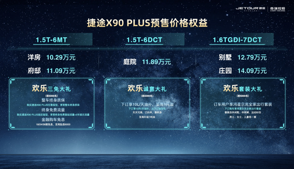 10.29万元-14.09万元的预售价,只是捷途汽车的见面礼,作为捷途汽车独立品牌之后上市的首款车型,捷途X90 PLUS还带来了无法抗拒的预售权益,三重礼遇诚意满满,为用户带来生活的享受。