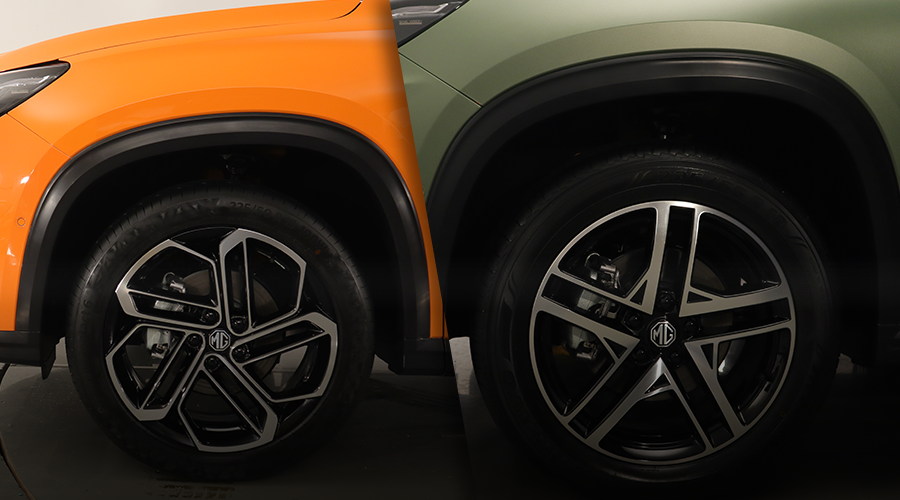 在车身侧面,两款车型在车身轮廓和线条的处理上保持一致。流畅的轮廓线条搭配硬朗的腰线使其车身侧面看起来颇有几分轿跑SUV的风范儿。而拱形的轮眉让MG ONE看起来更运动化一些。