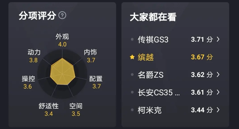 最后,我们来看下吉利缤越在懂车帝App的懂车分评价如何,这款车整体评分是3.67分,外观4.0分、动力3.8分、空间3.5分、操控3.6分,结合实际的体验感受来看,教授认为新款吉利缤越各项评分也达到了预期的分数。