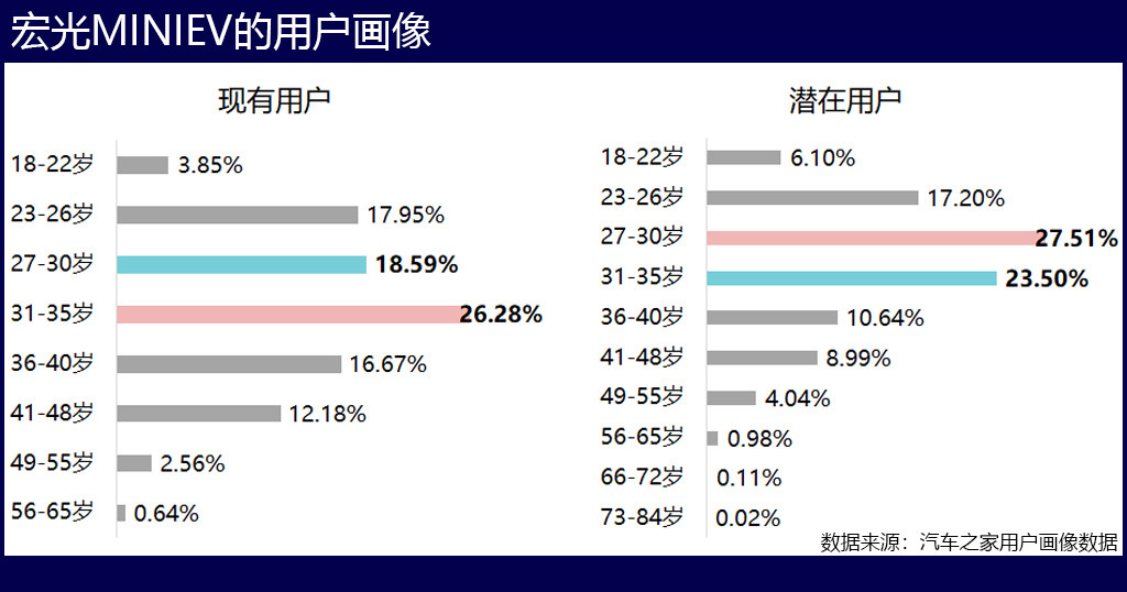 根据之家给出的调研数据显示23岁-30岁的用户占比已经超过了60%,其中潜在用户更是达到了77%。通过以上的数据我们不难看出,五菱宏光MINIEV的用户群体整体都是偏向于年轻化,更受年轻消费者的关注。