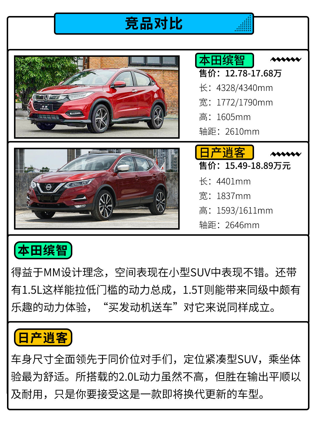 从表现来看,1.8L混动的卡罗拉Cross就因为这合资唯一的混动总成,是三者中油耗最低车型;搭载了177马力1.5T动力的本田缤智则是性能最强的,但小型SUV定位的它空间上却又是三者中不那么讨巧的一员;日产逍客车身尺寸全面优胜对手,乘坐最为舒适,但150马力的2.0L动力则处于中等水平,并且也处于生命周期末期。