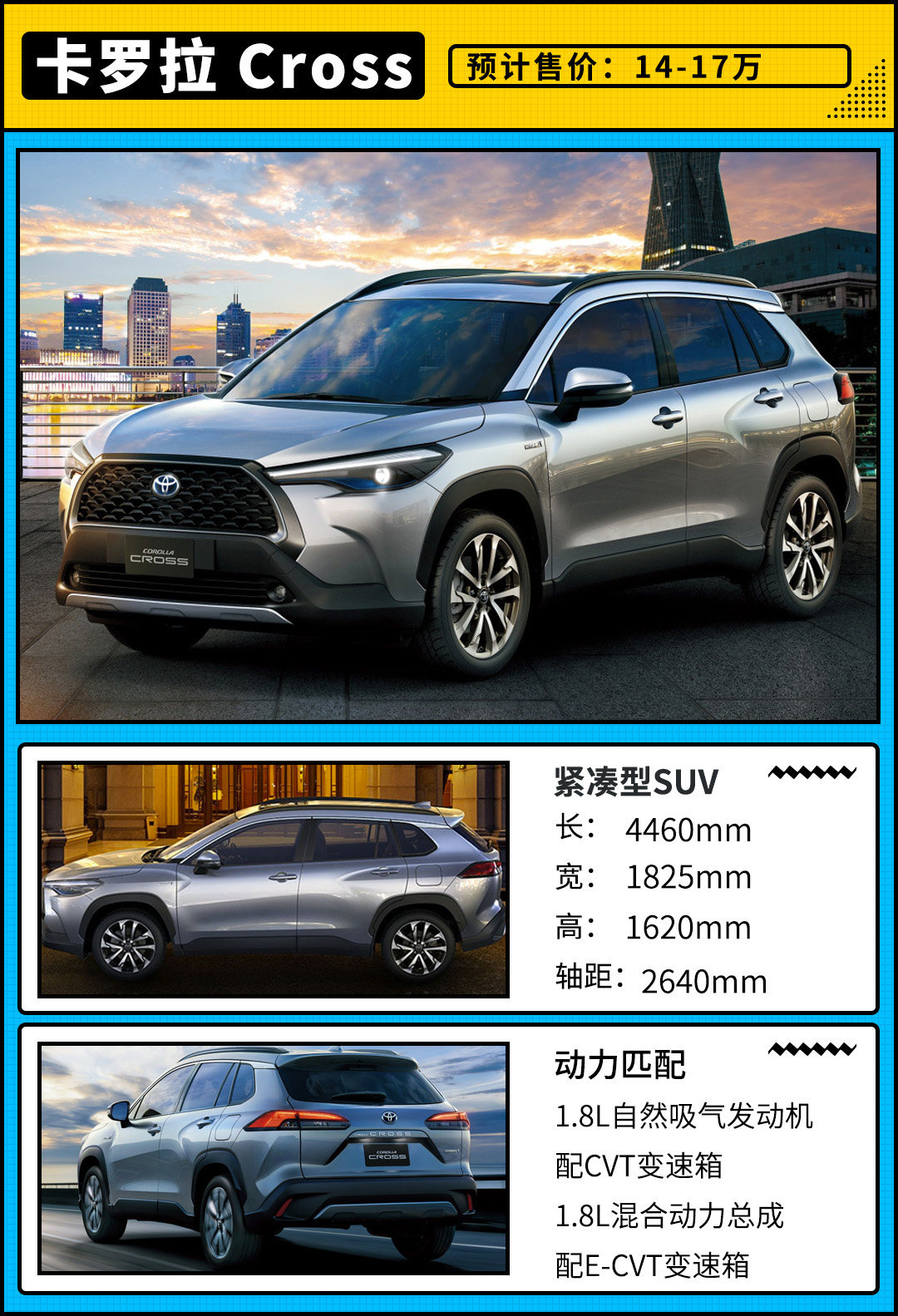 全系混动,价格维持在14-17万区间,那么就能进一步拓展丰田SUV在该价格的布局,并且卡罗拉Cross与C-HR还会形成高低互补,高配车型更不会侵占到RAV4的位置,毕竟如今不少消费者更情愿选择大一号的RAV4,而非C-HR混动车型。