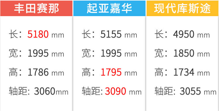 根据现有的信息来看,三款车的定位均为中大型MPV,其轴距表现差距并不大最大差值为35mm,但在车身长度方面,丰田赛那则是傲视群雄的存在。而起亚嘉华则在轴距方面更为优胜,达到了3090mm之多。相较于前两位大块头,现代库斯途则显得更为匀称一些,恰到好处车身数据,使得它开起来灵活性会更佳。