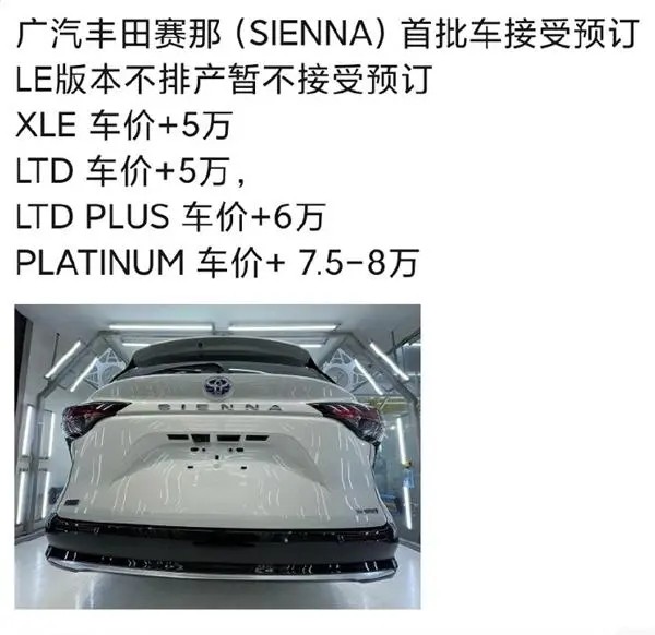 而日前社交平台就流传出一张赛那的加价图片,XLE和LTD均加价5万元,LTD Plus加价6万元,顶配车型Platinum需要加价7.5-8万元。