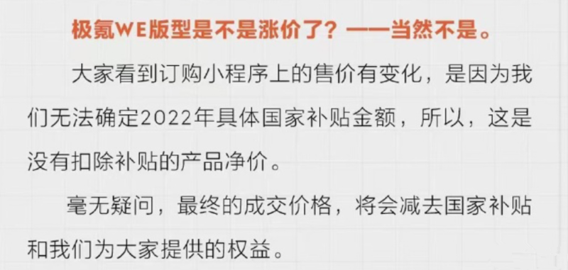 当然大部分的消费者是不懂极氪001加价背后的良苦用心,对此极氪汽车也给出了一个“正当”理由,这是因为目前还无法确定2022年国家对新能源汽车补贴的金额。
