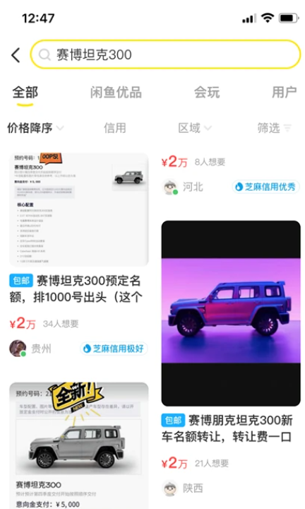 很快啊,二手交易平台上就出现了转订坦克300赛博版的交易帖,就别想着人家会原价转给你,加价两万转让了解一下。也不能怨人家加价两万是有违市场交易的规范准则,怪就怪自己的手速不够人家快,