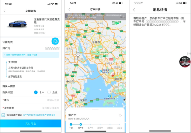 新的销售模式为消费者可以直接在线上预订购车,向广汽丰田官方交付2万元订金(排产后不可退,改为定金,但可更改配置重新排产),之后需要在3天内到选定的经销店签订购车协议,并在线下支付尾款与保险、购置税、上牌服务费等一系列费用。
