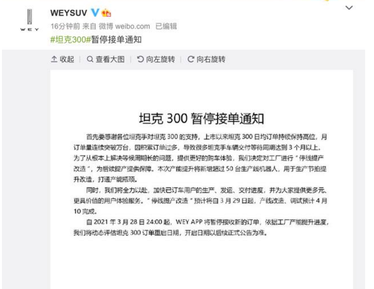 而销售的回复大致都是工厂已经爆单,早前为了消化原有订单,要暂时停止接单,并对生产线进行停线提产改造,现在提车周期至少在3个月以上。