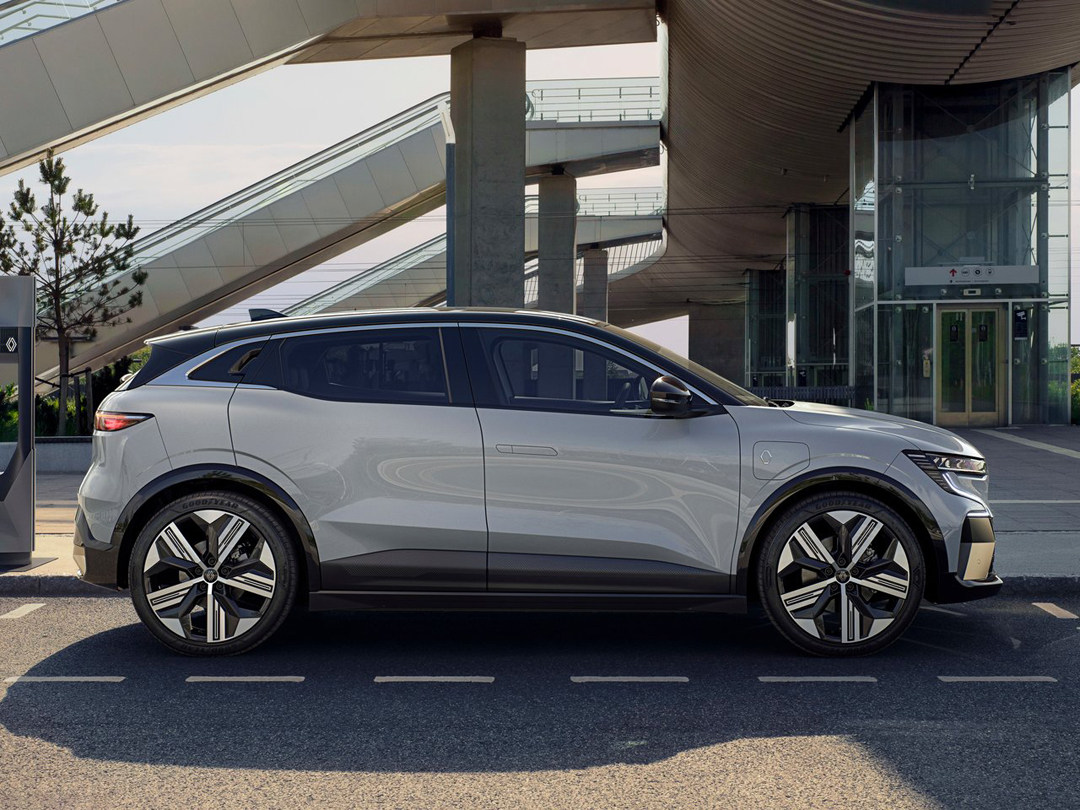 从车侧来看,梅甘娜E-Tech Electric窗线被提得非常高,同时A柱之后略微下沉,C柱之后又上挑,在保证车辆有足够视野的情况下给车辆带来相当动感的视觉感受。车门的面积较大,同时带有隐藏式门把手设计。