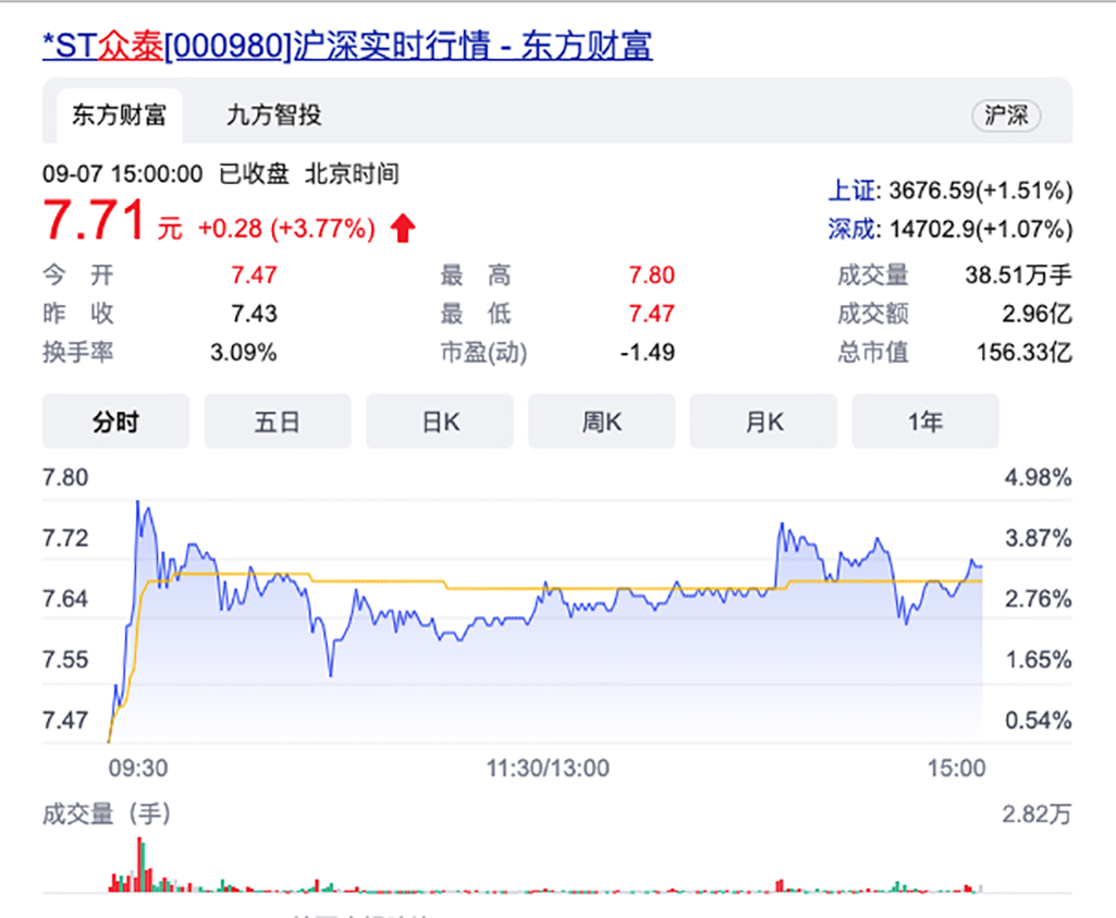 ST众泰,也是此次统计的亮点,营收下滑足足50.08%,净利润亏损7.53亿元,已经进入破产重整边缘。但在资本市场上则一路狂飙,多次涨停板。年初股价仅仅2元出头,但最高则达到了8.30元,甚至创下了3年内的新高,对于一个汽车销量近乎0的车企而言,涨幅相当可怕。