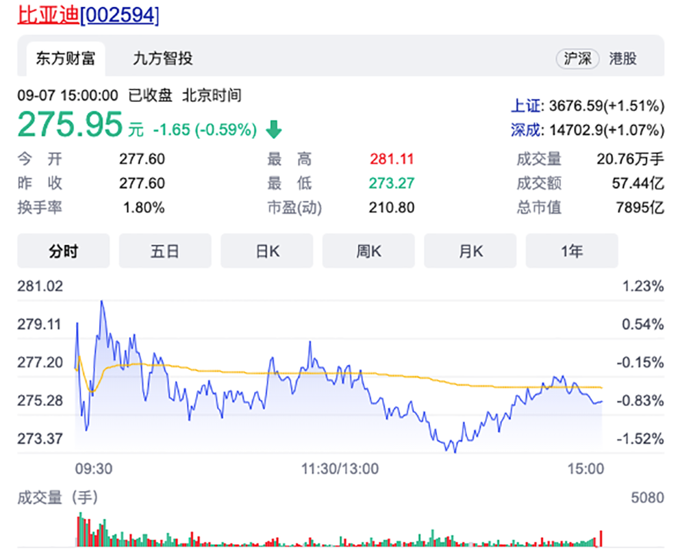 比亚迪绝对是2020年底至今的跃升黑马,反馈到资本市场上,它股价一路飙升,已经成为了中国最高市值车企,截止撰稿时(9月7日)股价275.95元,市值达到了7895亿元。而上汽集团则是21.03元,总市值2457亿元。