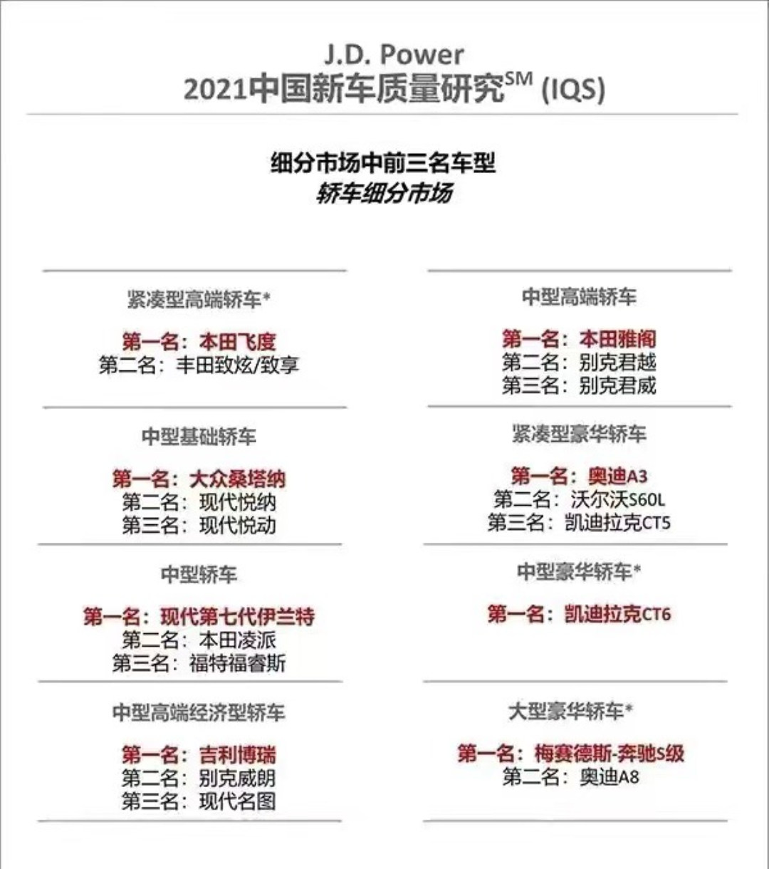 此外,如果从细分化市场来看,除了前面提及到雅阁和飞度分别在中型高端轿车市场和紧凑型高端轿车市场取得第一,大众桑塔纳获得中型基础轿车第一名,现代伊兰特获得中型轿车第一名、吉利博瑞获得中型高端经济性轿车第一,奥迪A3获得紧凑型豪华轿车第一名,凯迪拉克CT6获得中型豪华轿车第一名以及奔驰S级获得大型豪华轿车第一。