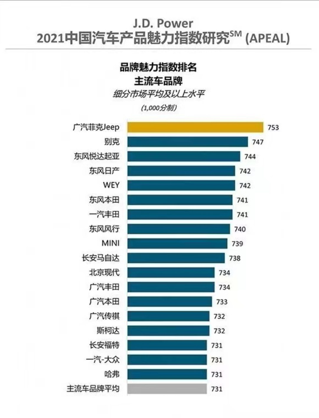 根据数据显示,Jeep汽车今年1-7月份累计销量不足1.2万辆,难道是因为购买的人少,质量反而变好了?同时再值得一提的是,在前不久J.D. Power公布的2021年中国汽车产品魅力指数研究报告中,Jeep居然也拿到了主流品牌第一名的好成绩,或许Jeep的质量真的改善了很多。