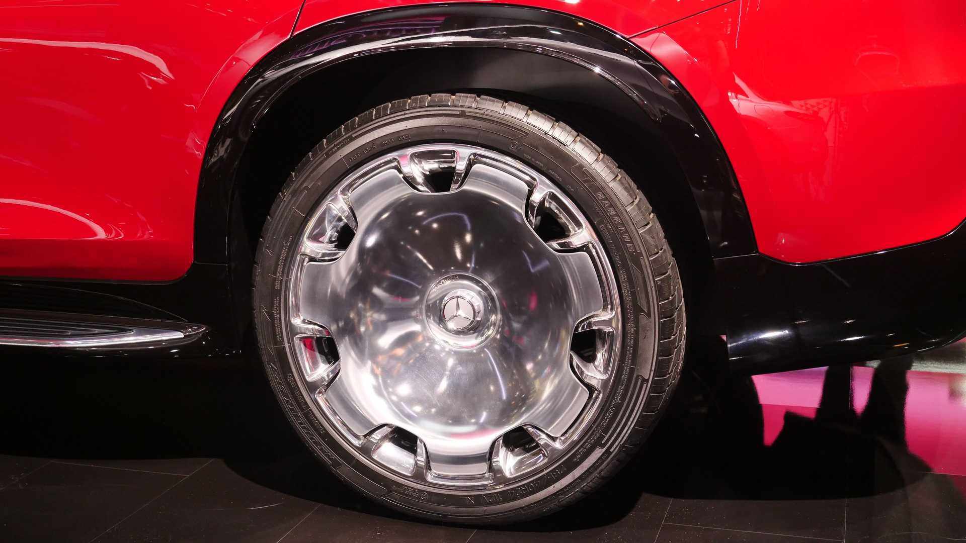 传统SUV的造型,应用上奔驰EQ家族的流线型设计,倾斜的A柱完全与车顶轮廓连在一起,并结合了后扰流板的气流分离边缘,连续过渡,没有中断和边缘,突出了无缝设计的特征。车侧经过空气动力学优化的侧踏板带有定制的迈巴赫标志,S级造型设计的24英寸的大饼轮毂,致敬经典的同时,又能满住低风阻的需求。