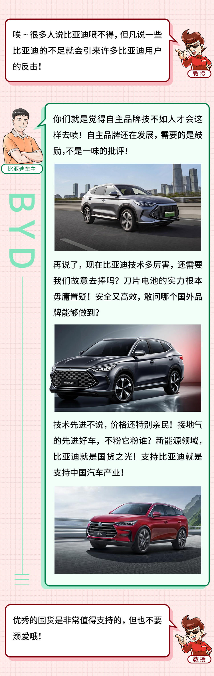 在国内自主品牌里,比亚迪的车主忠诚度其实也不容小觑,作为最成功的自主品牌之一,比亚迪的车主对于他们的爱车可以说是相当自豪。