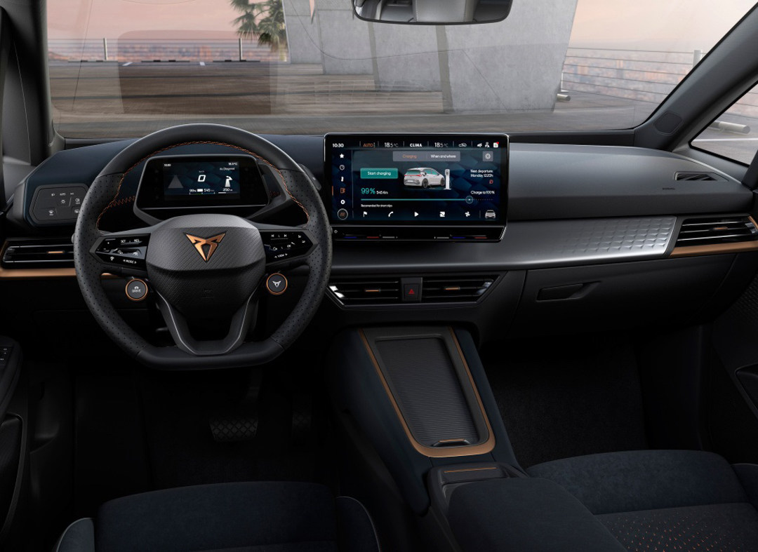 内饰方面同样如此,Cupra Born整体布局延续了大众ID.3的设计风格,主要由12英寸悬浮式中控屏、三幅式多功能方向盘、液晶仪表盘、电子怀挡等元素组成,除了更大尺寸的中控屏之外,新车还用上了更时尚的古铜色,让人眼前一亮。