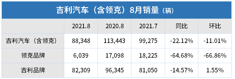 8月份,吉利汽车(含领克)的销量为88,348辆,环比下跌11%,同比下跌22.12%。其中领克下滑最为严重,当月销量为6,039辆,环比暴跌66.9%,同比跌64.68%;吉利品牌相对好一些,单月销量为82,309台,环比增长1.55%,同比下降14.57%。