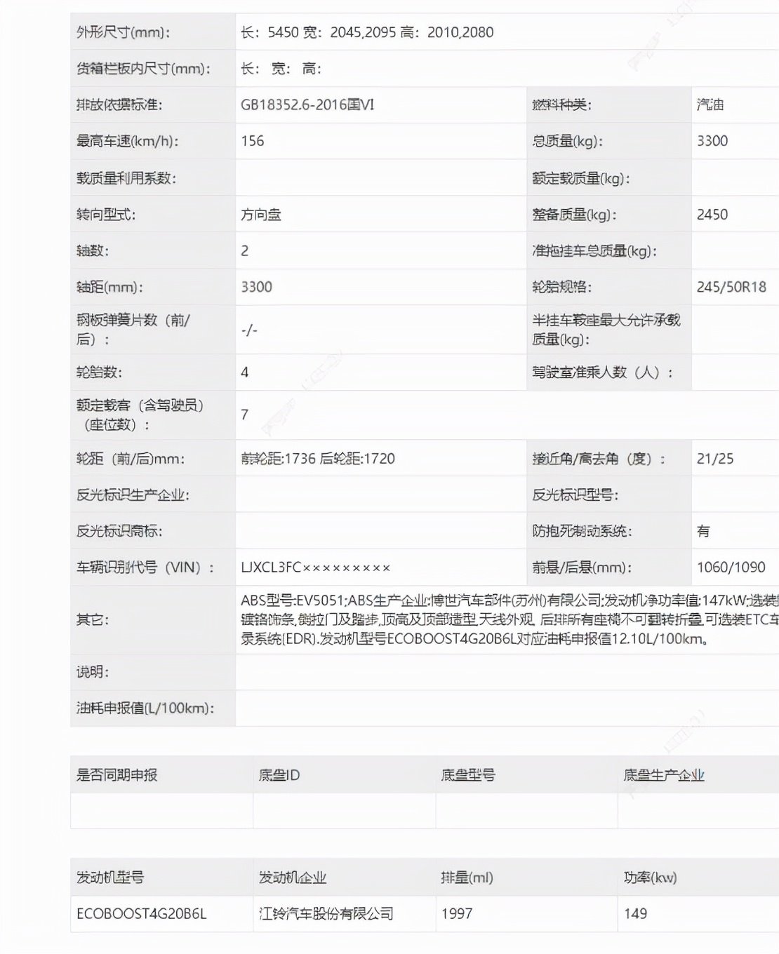 车侧整体视觉与福特途睿欧车型都有着千丝万缕的关系,不过尾门开启方式却调整为上掀式。申报图信息显示,新车长宽高分别为5450/2045(2095)/2010(2080)mm,轴距为3300mm,车身尺寸以及轴距都远比福特途睿欧(4976/2095/1990mm,2933mm)大得多,说其车身尺寸更像是一台江铃福特全顺也不为过。