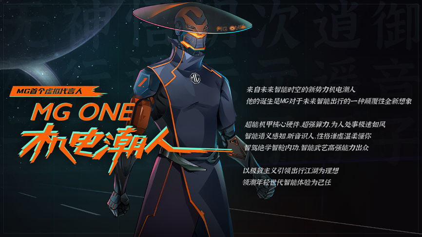 MG ONE机电潮人,作为全真派2021掌门,是MG首个虚拟代言人,Ta的诞生是MG对于未来智能出行的一种颠覆性全新想象。Ta是来自未来智能时空的新势力,拥有超能机甲的核心硬件,有超强算力的最强大脑;Ta为人处事极速如风,智能语义感知过人,不仅可以听音辨人,还性格谦虚、温柔懂你;Ta身怀智驾绝学,内蕴智舱武功,是一个智力超群、战力高强、能力出众的虚拟人。