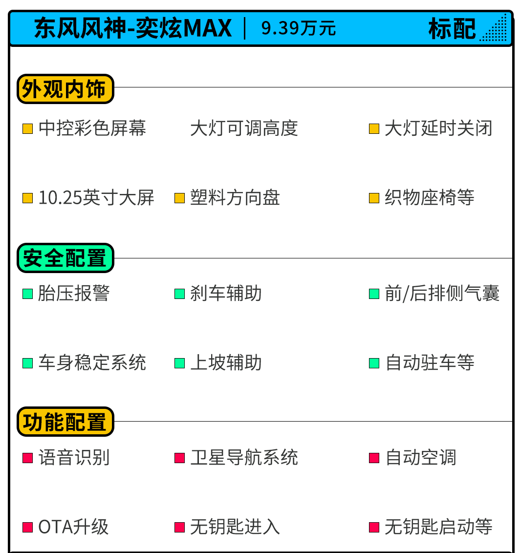 作为入门版车型,东风风神奕炫MAX超凡萌爸版虽然售价低至9.39万元,但却配备17英寸铝合金轮圈、卤素前大灯、全景天窗、外后视镜手动调节、塑料方向盘、换挡拨片等,但说到性价比方面则显得不高,若然购车预算并不是十分吃紧,买买君并不推荐购买入门版车型。