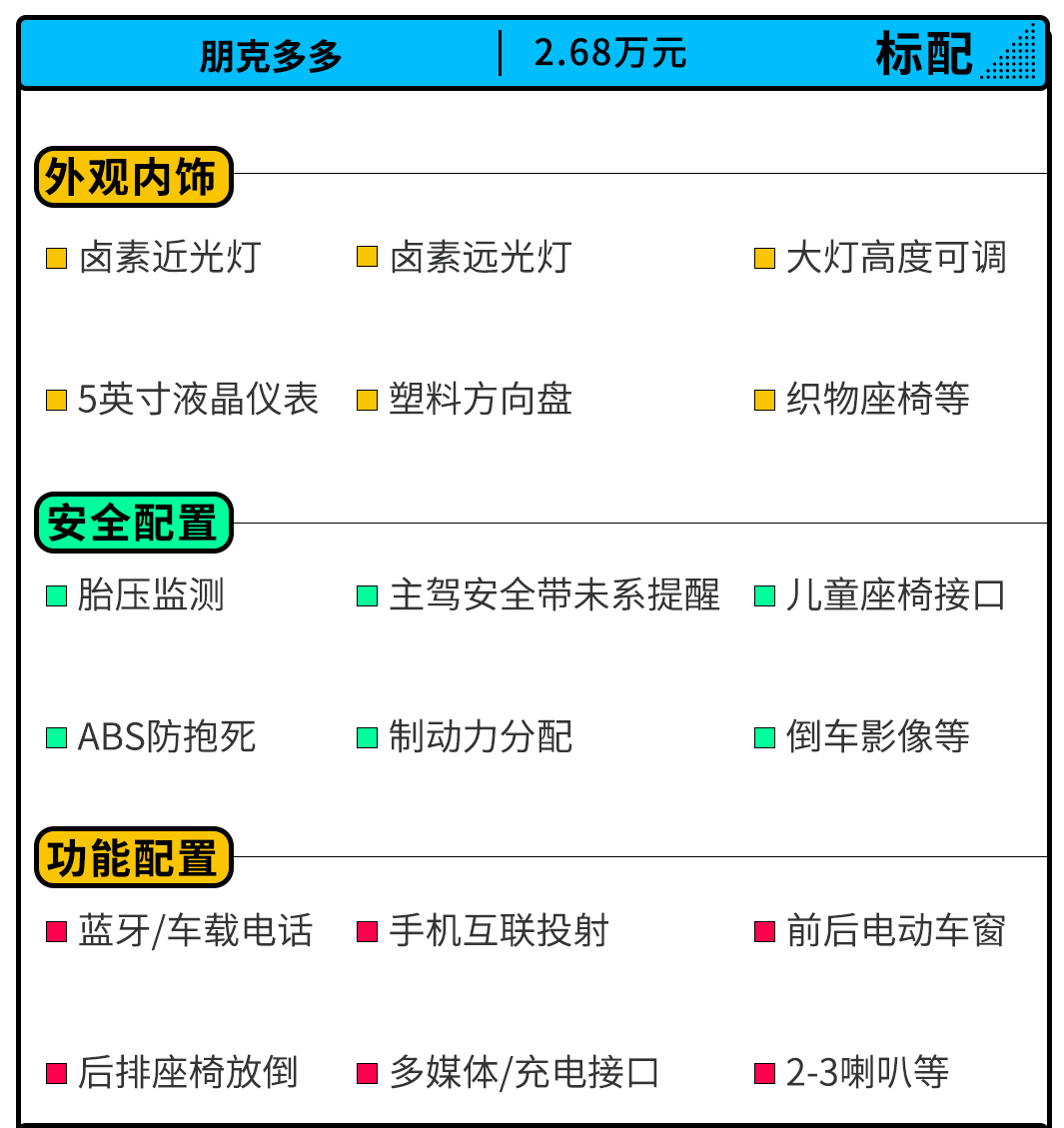 作为入门版车型,朋克多多 2021款 靓多多版虽然售价低至2.68万元,但配备了胎压监测、ABS防抱死、倒车影像、塑料方向盘、上坡辅助、7英寸触摸屏、织物座椅、上坡辅助等配置,但却没有配备空调,这确实是个值得吐槽的槽点,但看着这低廉的价钱,确实不能要求太高。