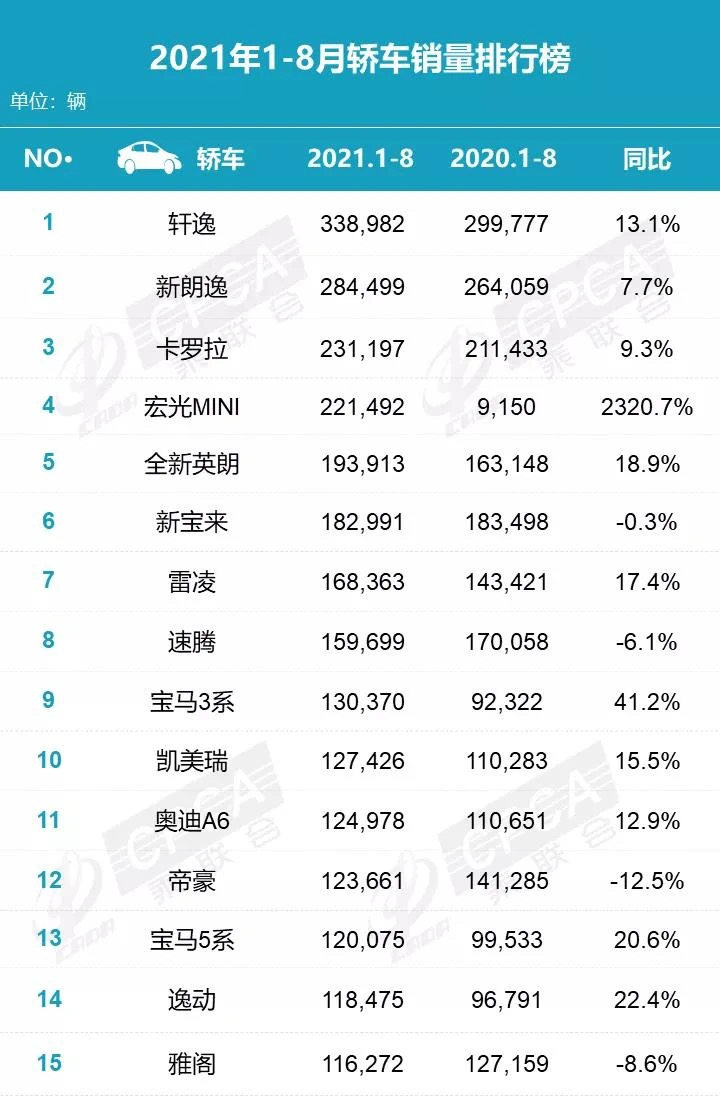 当然也不乏一些车型逆势上涨,只是寥寥无几,在8月轿车销量排行榜前十五之中,唯有日产轩逸、五菱宏光MINIEV以及日产天籁三款车实现正增长,其中宏光MINIEV同比增长高达259.0%,真是让人受宠若惊。更值得一提的是,宏光MINIEV今年1-8月份累计销量221,492辆,同比增长2320.7%,有望在9月份实现对卡罗拉的反超,晋级轿车销量榜前三甲位置。