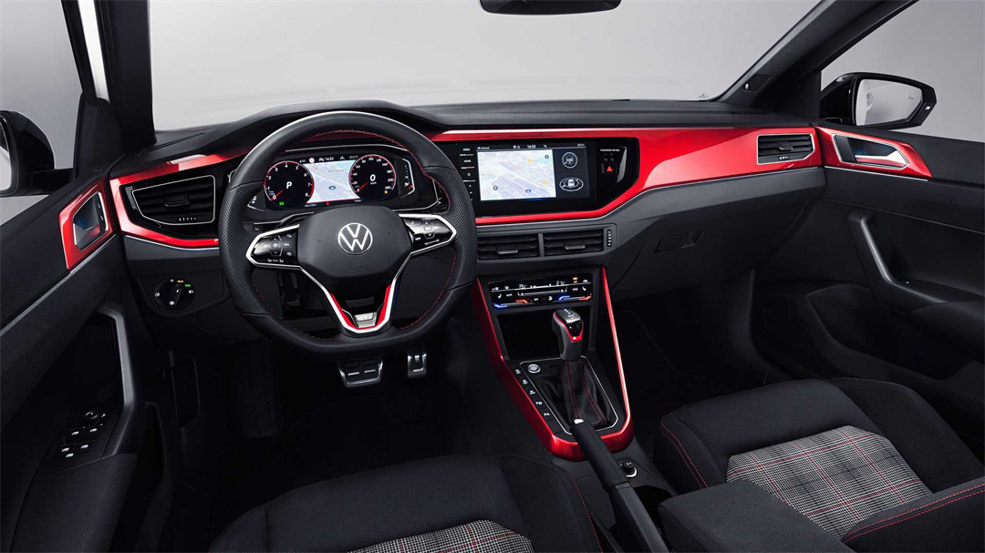 内饰部分,新大众POLO GTI的内饰布局整体没有发生太大变化,主要是部分配置得到智能化提升。例如,10.25英寸的数字仪表盘、8英寸的中控触摸屏(可选9.2英寸)、手机无线充电等功能。