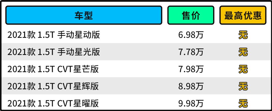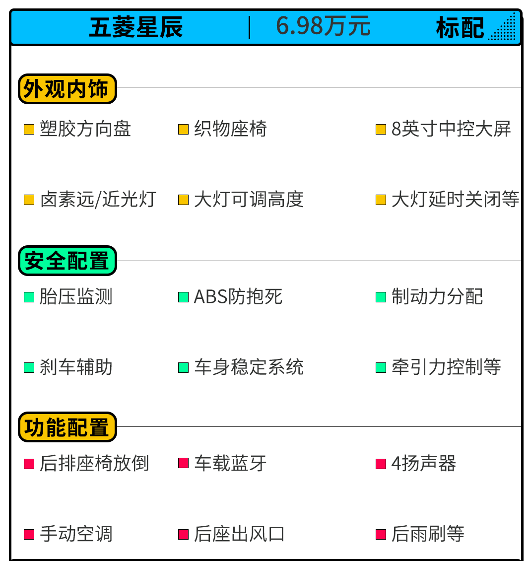 五菱星辰2021款 1.5T 手动星动版作为入门版车型,其售价低至6.98万元,只提供了胎压监测、8英寸中控大屏、手动空调、塑料方向盘等配置,可以说得上丐中丐版车型,若然购车预算并不是十分吃紧,买买君并不推荐购买入门版车型。