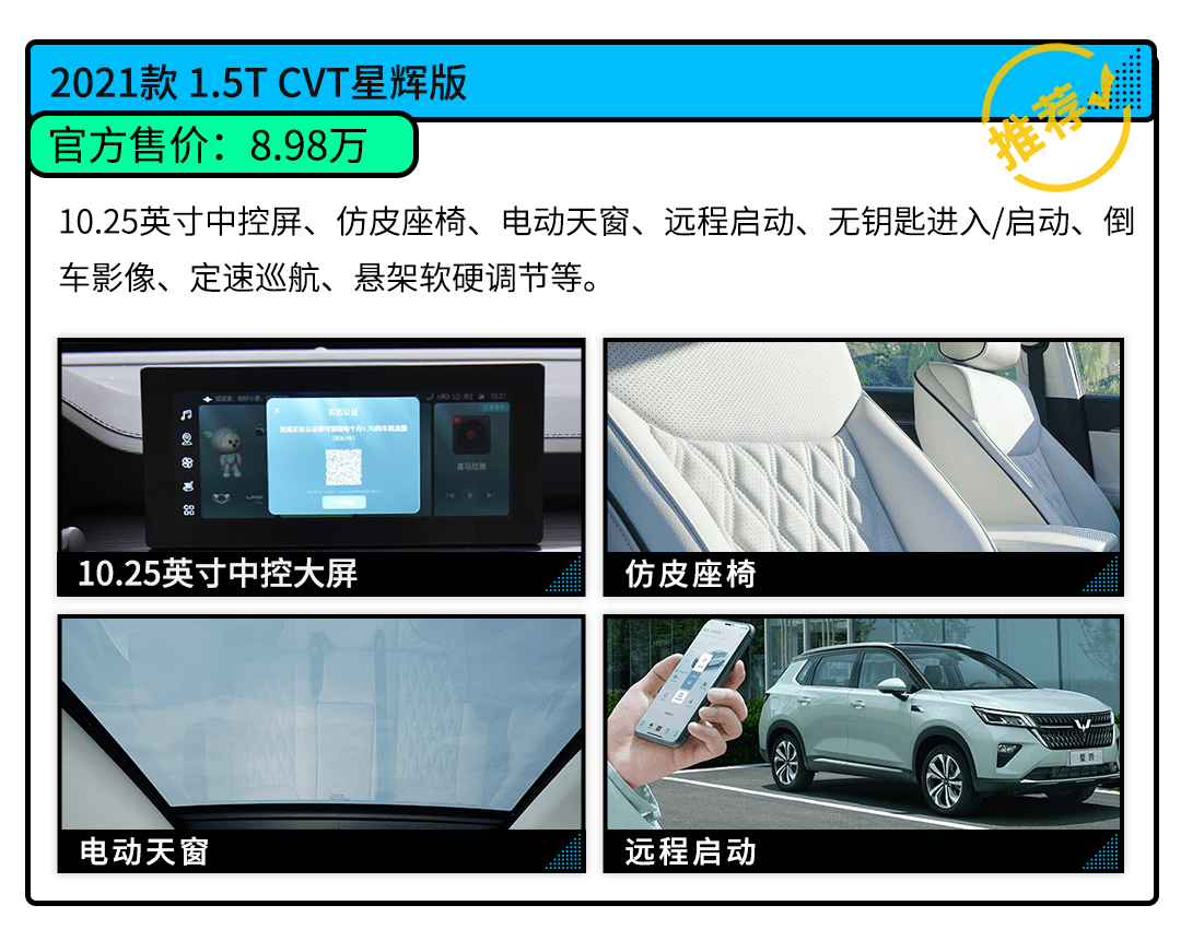 五菱星辰1.5T CVT星辉版比五菱星辰1.5T 手动星动版贵了2万元,但配置却增加了不少,包括10.25英寸全液晶仪表、电动天窗、悬架软硬调节、定速巡航、远程启动、语音识别系统等功能。总的来说,这2万元花在了实在的地方,所以买买君非常推荐。