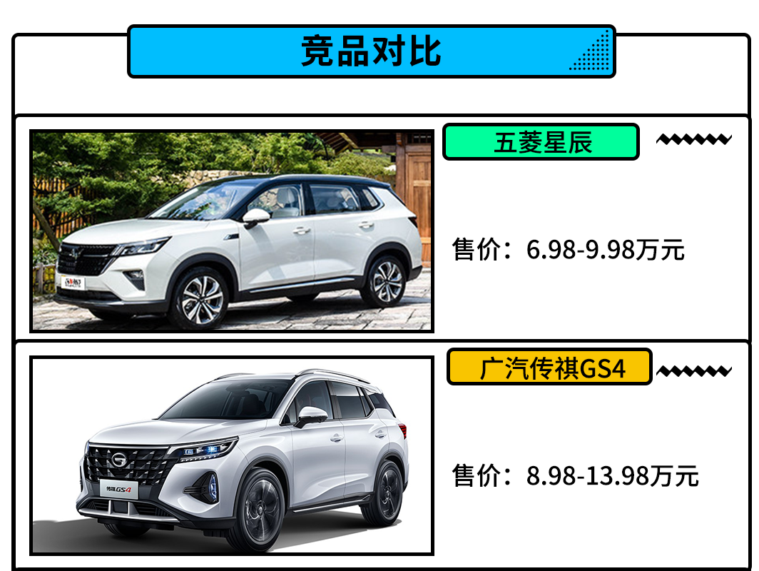 五菱星辰虽然定位为紧凑型轿SUV,但从车身尺寸以及官方售价来看,其最直接的竞争对手莫过于广汽传祺GS4这款紧凑型SUV。五菱星辰与广汽传祺GS4相比较,前者轴距部分无疑更加优秀,而在最为重要的价格方面,五菱星辰拥有绝对优势。