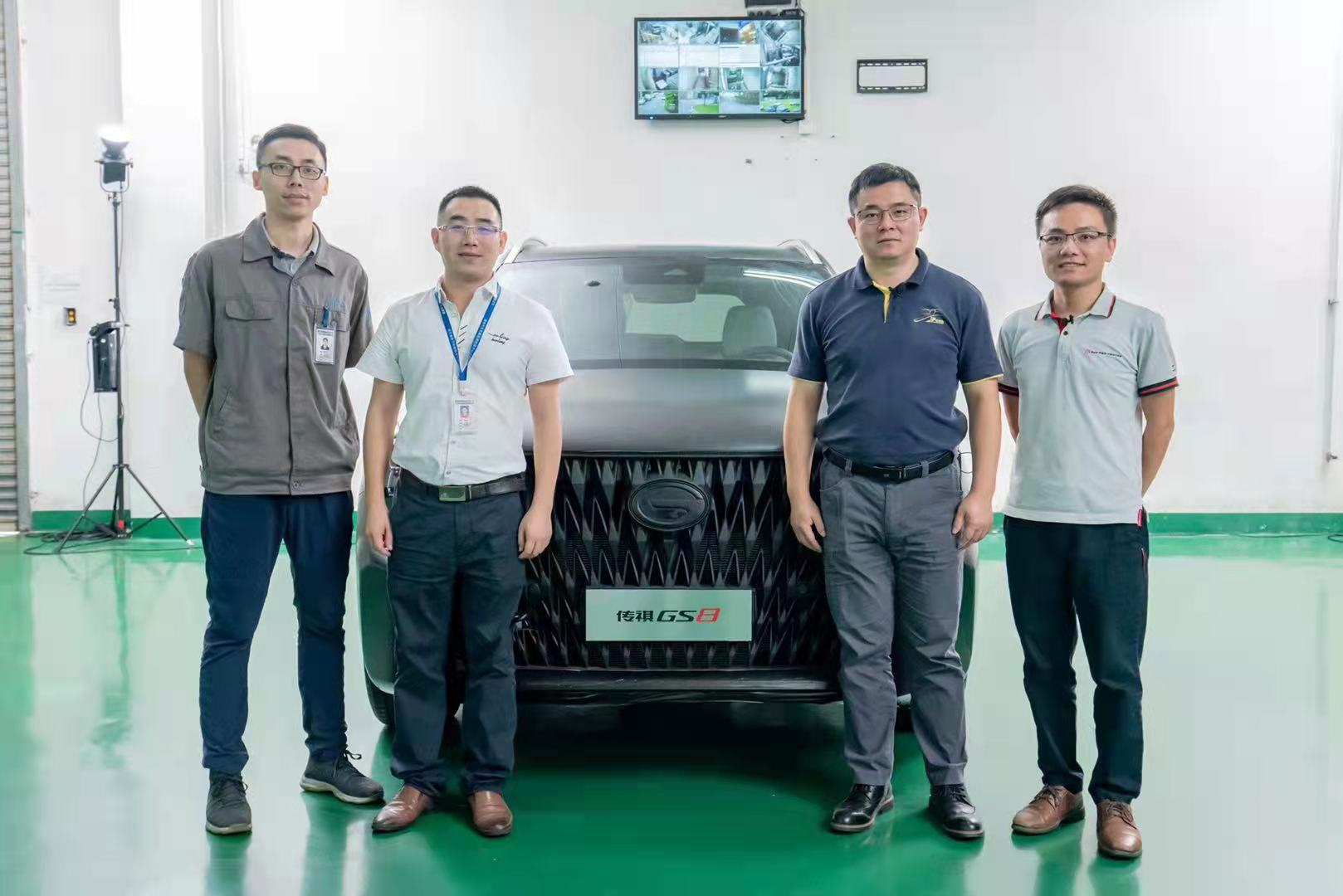 国家汽车质量检测检验中心(广东)排放检测部部长曹金珠(左二)、检验工程师邱慧龙(左一),广汽研究院整车集成部部长兼全新第二代GS8车型研发总监曹勇(右二)、系统集成科科长朱永明(右一)
