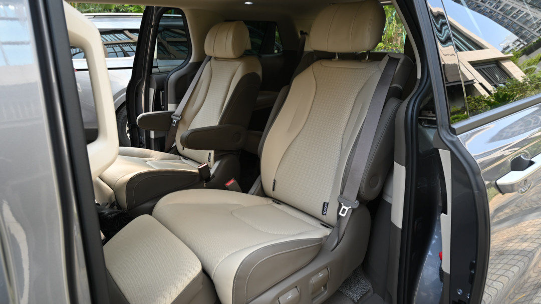 而第三排也是潜在消费者最关心的地方,首先横向空间也足够宽敞,满满当当塞下3个成年人基本毫无压力,腿部空间得益于第二排座椅调节比较广,移动至前同样腿部距离超两拳,基本上第二排调整至合理的空间,都能获得较理想的前后空间分配。而且第三排座椅靠背还支持多角度可调,无论你怎么坐都可以找到比较舒服的坐姿。