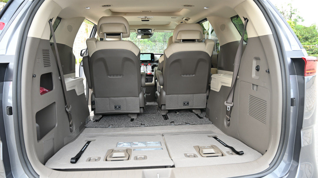 与此同时, 后备厢空间多种灵活的组合方式,突显了MPV车型的多功能性,由于后备厢采用下沉式设计,即使满员的情况,常规容积就达到了627L,放几大号的行李箱也是非常从容不迫,收起第三排座椅后,后备厢空间扩展至1793L,这时候拉一些新买的大件家具什么的,也十分的轻松。