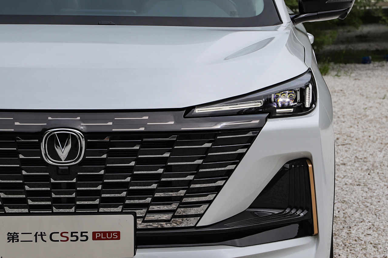 首先,全新CS55PLUS最大的变化就是外观更加的夺人眼球,这主要得益于采用了家族UNI-T的设计语言,基本了复刻了“无边界”进气格栅设计,构造出非常时尚、新颖的视觉效果。而教授觉得非常有意思的是,中网顶部位置还加入了一条透明的装饰件进行点缀,在特定角度能显示出光影效果。